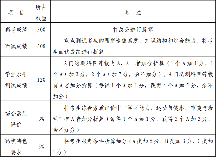 对于符合基本要求的入选考生,学校结合考生高考成绩、面试成绩、学业水平测试成绩、综合素质评价情况及高校特色要求,采用多元综合加权评价的方法,对入选考生按文、理科分别进行排序。根据专业计划数,结合考生专业志愿,择优录取,额满即止。